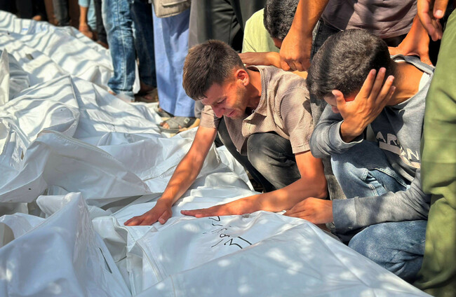 Relatives of Palestinians who were killed mourn in Nasser hospital after an Israeli bombing at a school sheltering displaced people in Khan Younis on 4 June. Alamy Stock Photo