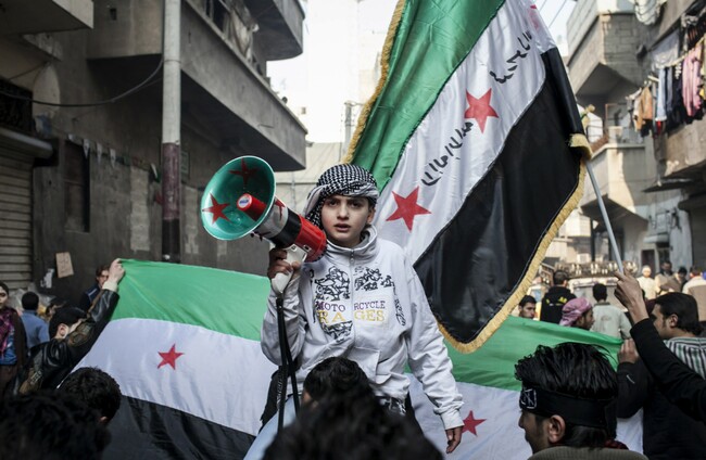 A child uses a megaphone to chant Free Syrian Army slogans during a demonstration in 2013. Associated Press