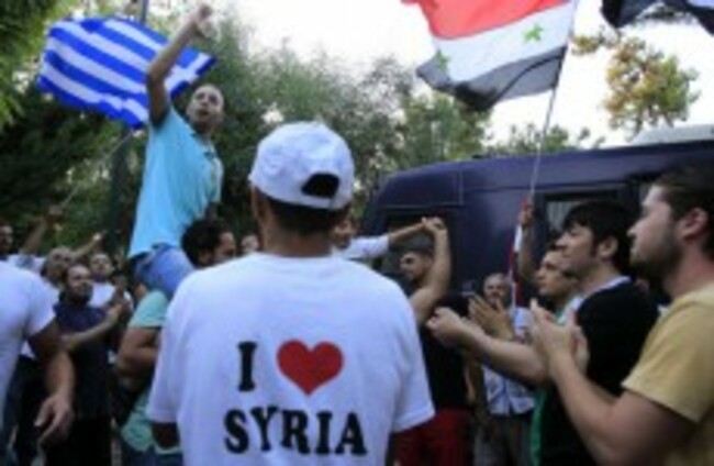 Syrians who live in Greece and Greek supporters shout slogans outside the Syrian embassy in Athens AP Photo/Thanassis Stavrakis