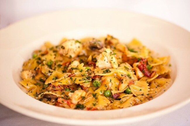 This pasta dish contains chicken, mushrooms ,tomato, pancetta, peas and caramelized onions in a cream sauce for 2,410 calories, 63 grams of saturated fat and 1,370 milligrams of sodium.