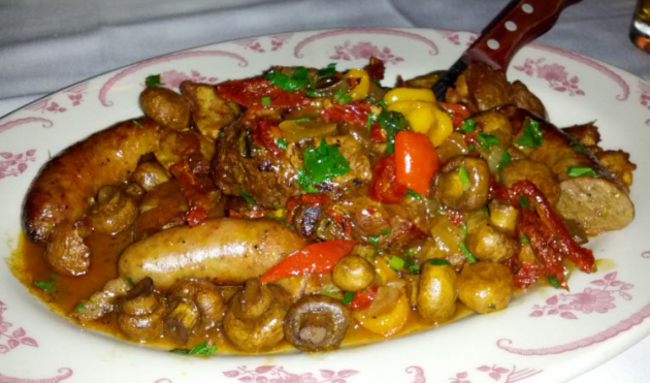 The steak is prepared “Contadina Style,” meaning it includes two Italian sausage links, potatoes, roasted peppers and mushrooms, caramelized onions, sun-dried tomatoes, steak jus, and garlic butter.