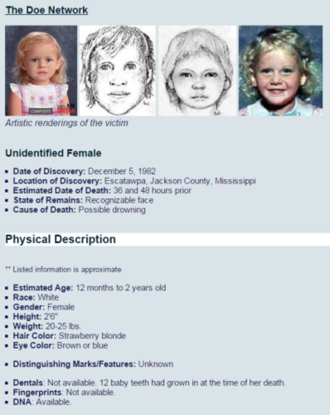 The Doe Network, which focuses mainly on unidentified remains found in the United States, is run by volunteers. Profiles in this database are even more detailed than the UK website, with details of the possible cause of death of the deceased and whether or not fingerprints or DNA is available.