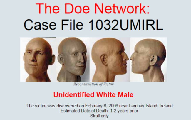 There is one Irish case listed on The Doe Network’s website. A man’s skull was recovered at sea by the skipper of the ‘Our Treacy’ fishing trawler in February 2006. He is estimated to have been aged between 25 and 45 when he died and was possibly North African.