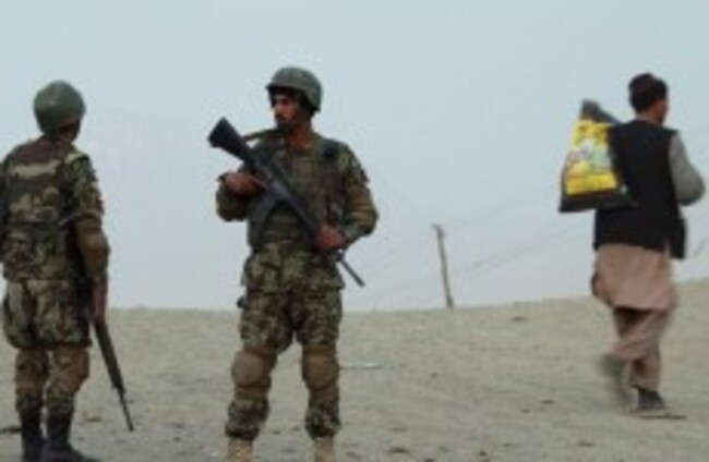 Officers of the Afghan army stand on patrol. A German magazine has published photos of US soldiers apparently posing with the corpses of dead Afghan civilians. Dar Yasin/AP