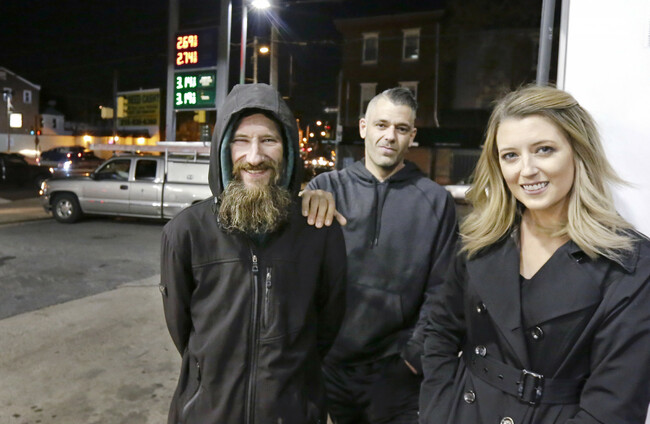 Johnny Bobbitt Jr, left, Kate McClure, right, and McClure's boyfriend Mark D'Amico pose at a Citgo station in Philadelphia. Elizabeth Robertson