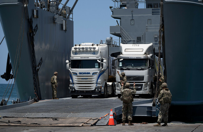 US soldiers gestures as trucks loaded with humanitarian aid arrive at the U.S.-built floating pier in Gaza. Alamy Stock Photo