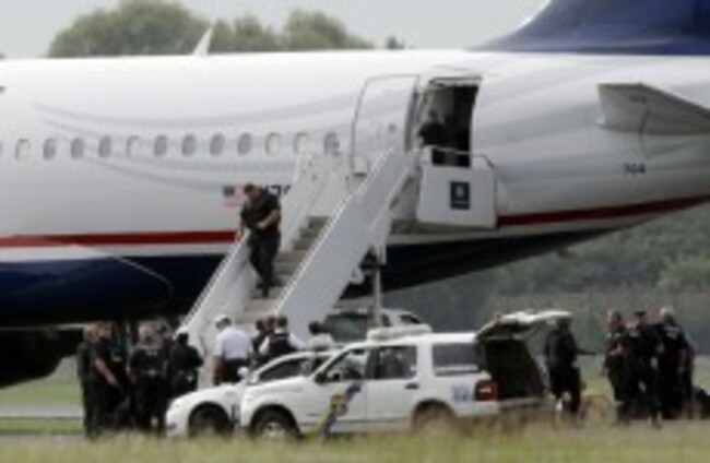 Law enforcement at the plane when it returned to the airport in Philadelphia today. AP Photo/Matt Rourke