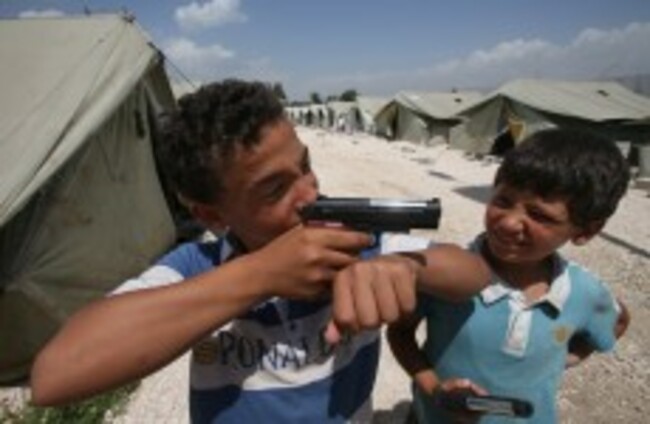 Jamal, an 11-year old Syrian refugee, left, points his toy gun as he plays with his friend, at a temporary refugee camp in the eastern Lebanese town of Marj near the border with Syria. Hussein Malla/AP/Press Association Images