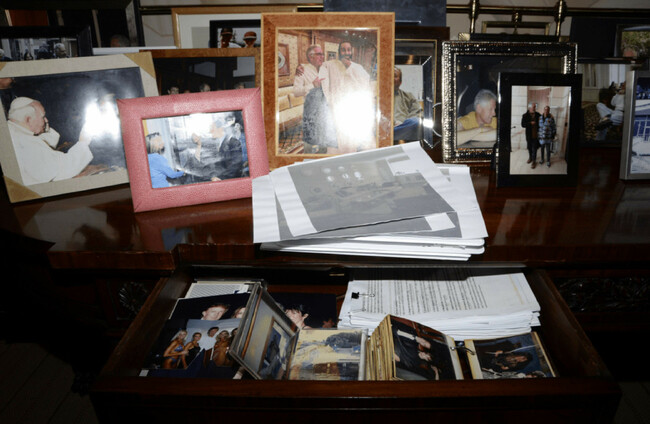 The photograph shows a desk with framed photographs of Epstein meeting a number of people, including Pope John Paul II. Inside the open drawer of the desk, an image of Trump standing with a number of women can be seen.