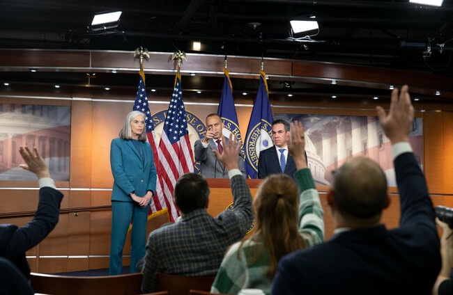 United States House Minority Leader Hakeem Jeffries (Democrat of New York) takes questions at a House Minority Leadership meeting Alamy
