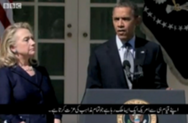A screen grab from the advert being run in Pakistani TV, which features Barack Obama and Hillary Clinton speaking with Urdu subtitles. BBC