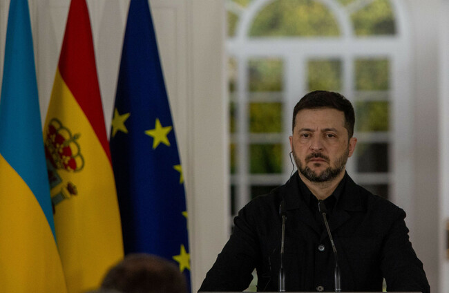 Ukrainian President Volodymyr Zelensky insisted today that any deal to end Russia's invasion must bring a "dignified peace". Pictured speaking earlier this week at Moncloa Palace in Madrid. Alamy Stock Photo