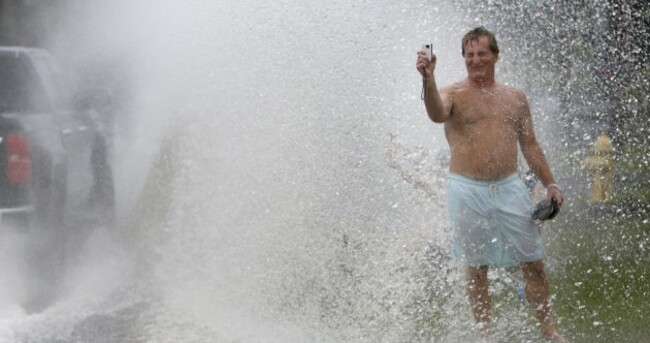 East Coast Rainstorm South Carolina Vacationer Tony Rerrick videos being sprayed by flood waters on Palm Blvd. on the Isle of Palms, S.C. Mic Smith Photography LLC Mic Smith Photography LLC