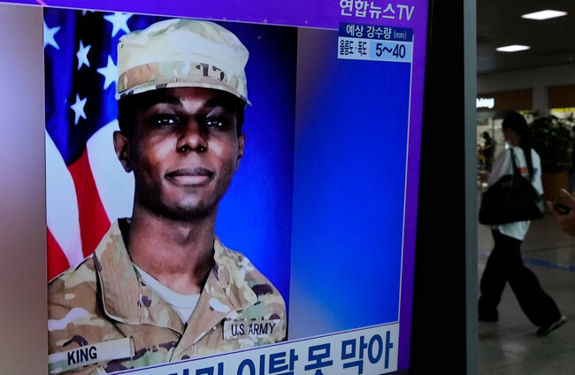 A TV screen shows American soldier Travis King. Ahn Young-joon/AP