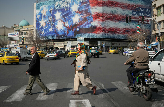 Pedestrians in Tehran walk past a billboard depicting a US aircraft carrier with damaged fighter jets and blood. Alamy Stock Photo