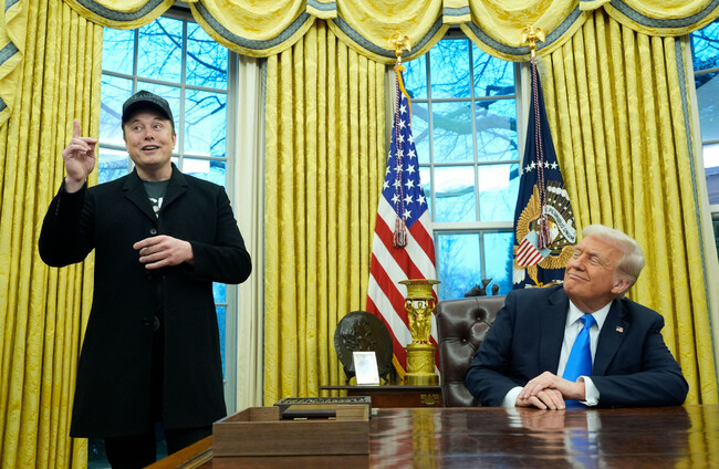 President Donald Trump listens as Elon Musk speaks in the Oval Office. February 2025. Alamy