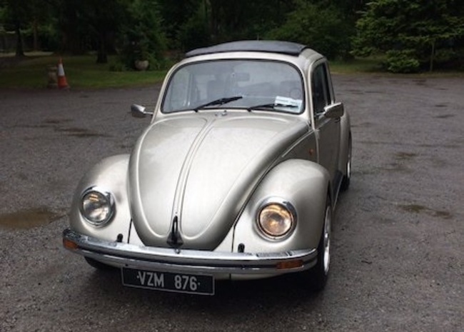 This 1976 Volkswagen Beetle 1200 model was fully restored in 2015 and now has a 1.6-litre fuel injection engine. It is finished in a shimmering gold colour with funky alloys and has a full black leather interior and cool retractable fabric roof.
