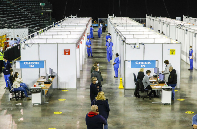 People queuing to receive the vaccine at the Covid-19 vaccination centre in the SSE Arena, Belfast (Liam McBurney/PA)