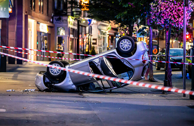 rooftop-car-crash Emergency services working at the scene where a car landed on the footpath at Baggot Street Upper in Dublin on Sunday evening. DAMIEN STORAN DAMIEN STORAN