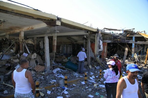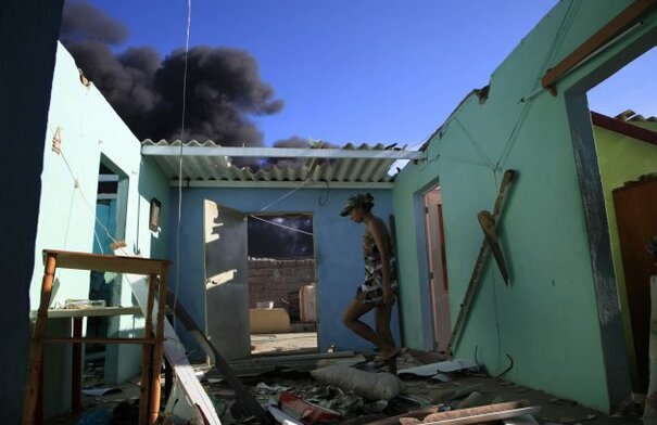 People stand in front of damaged commercial shops after a explosion in the Amuay refinery. (AP Photo/Ariana Cubillos/PA)