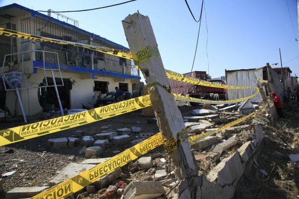 Rescue workers walk past a damaged area on Sunday. (AP Photo/Ariana Cubillos/PA)