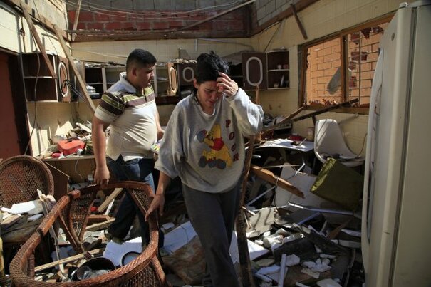Magda Caseres walks among debris of her home shattered by the explosion. (AP Photo/Ariana Cubillos/PA)