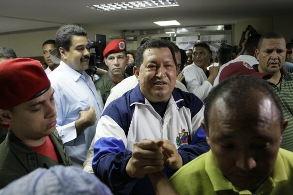 President Hugo Chavez greets supporters during a visit to injured people at the Rafael Calle Sierra's public hospital in Punto Fijo on Monday after the refinery explosion. (AP Photo/Ariana Cubillos/PA)