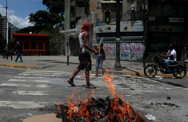 A demonstrator blocks a street during a rally against Venezuela's President Nicolas Maduro's government in Caracas. Reuters/PA Images