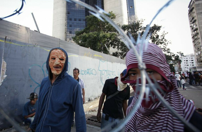 Masked protesters seen behind a fence during a mass protest against Venezuelan President Nicolás Maduro in Caracas this week. Boris Vergara/DPA/PA Images