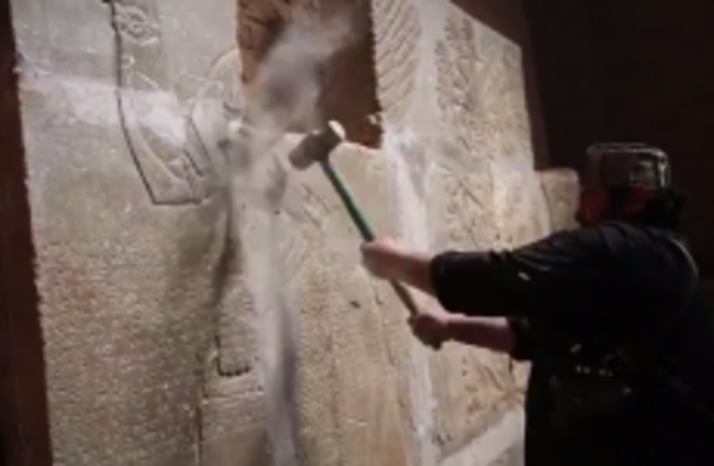 It shows militants using sledgehammers and angle grinders to destroy artefacts before the site is completely destroyed by massive explosions.