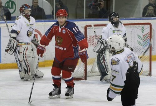 Putin plays ice hockey in a training session with teenage players at the Luzhniki stadium in Moscow last April. (AP Photo/Mikhail Metzel)