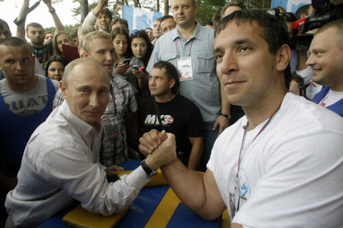 No pressure... Putin judges an arm wrestling match during a visits in the Seliger youth educational forum about 450 km northwest of Moscow earlier this month. (AP Photo/Mikhail Metzel,Pool)