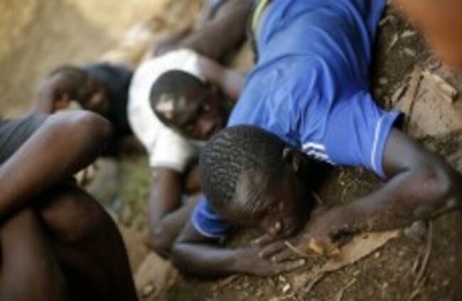 Men take cover as heavy gunfire erupts in the Miskin district of Bangui, Central African Republic AP Photo/Jerome Delay