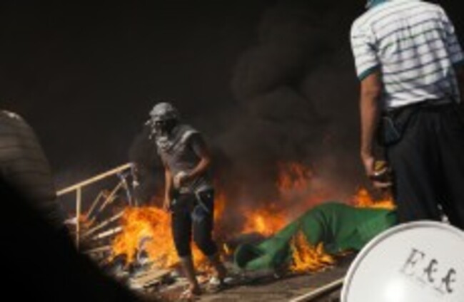 A supporter of ousted Egyptian President Mohammed Morsi passes a fire barricade carrying a gasoline bomb during clashes against security forces in Cairo's Nasr City district. Manu Brabo/AP/Press Association Images