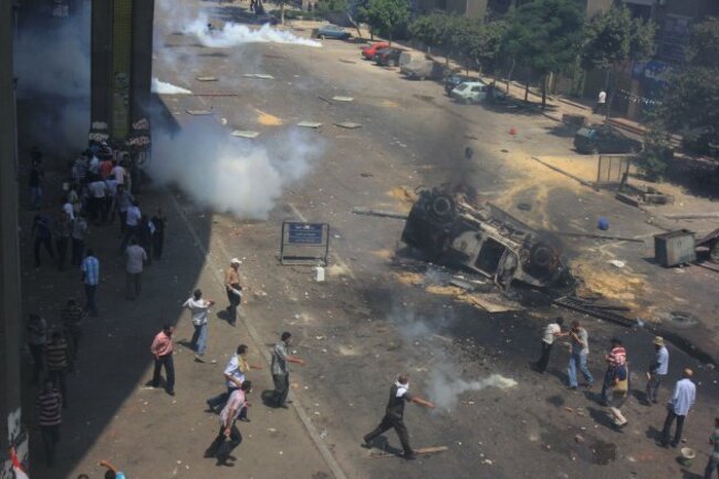 Supporters of Egypt’s ousted President Mohammed Morsi clash with security forces near the largest sit-in by supporters of Morsi in the eastern Nasr City district of Cairo. (Mohammed Abu Zeid/AP/Press Association Images)