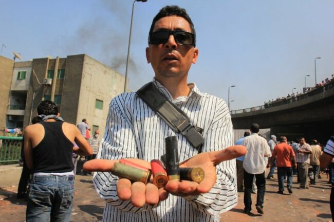 A supporters of Egypt’s ousted President Mohammed Morsi shows spent ammunition during clashes with security forces near the largest sit-in by supporters of ousted Islamist President Mohammed Morsi in the eastern Nasr City district of Cairo. (Mohammed Abu Zeid/AP/Press Association Images)