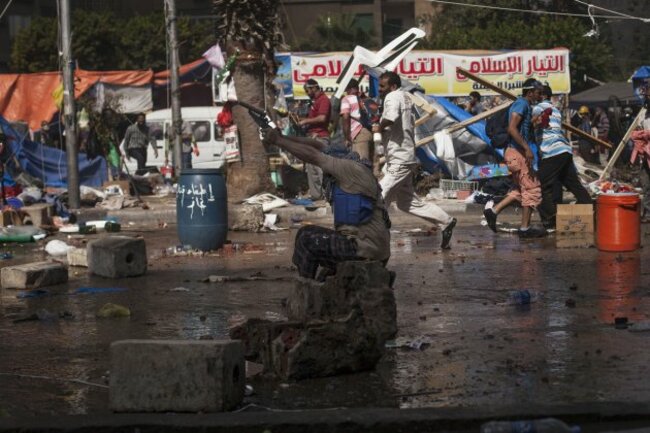 A supporter of ousted Islamist President Mohammed Morsi shoots a gun towards the Egyptian Police at a sit-in at Rabaah al-Adawiya. (Manu Brabo/AP/Press Association Images)