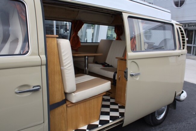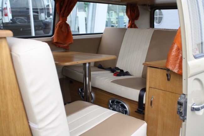 This 1969 camper is known as a ‘Bay’ due to its bay front window and has a Devon Pop Top roof. It has had a full restoration and has been completely reupholstered with cream and tan leather and retro-style black and white floor.