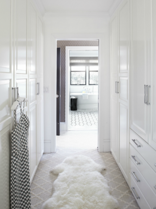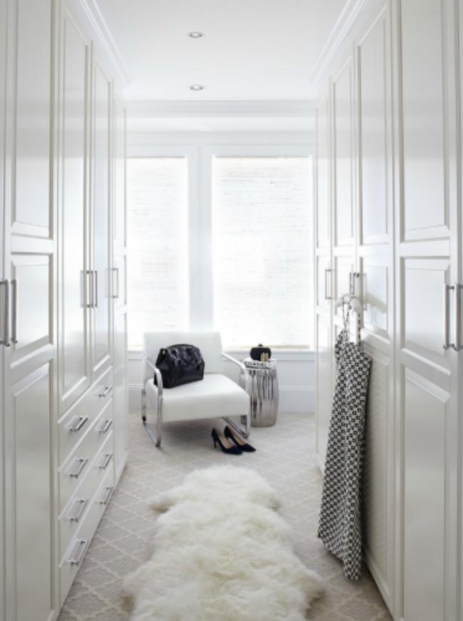 The sheepskin rug and patterned carpet add a touch of glamour but if you look closely, the closet itself is simply an assortment of Pax doors and drawers from Ikea. Some simple chrome handles and the look is streamlined and sleek.