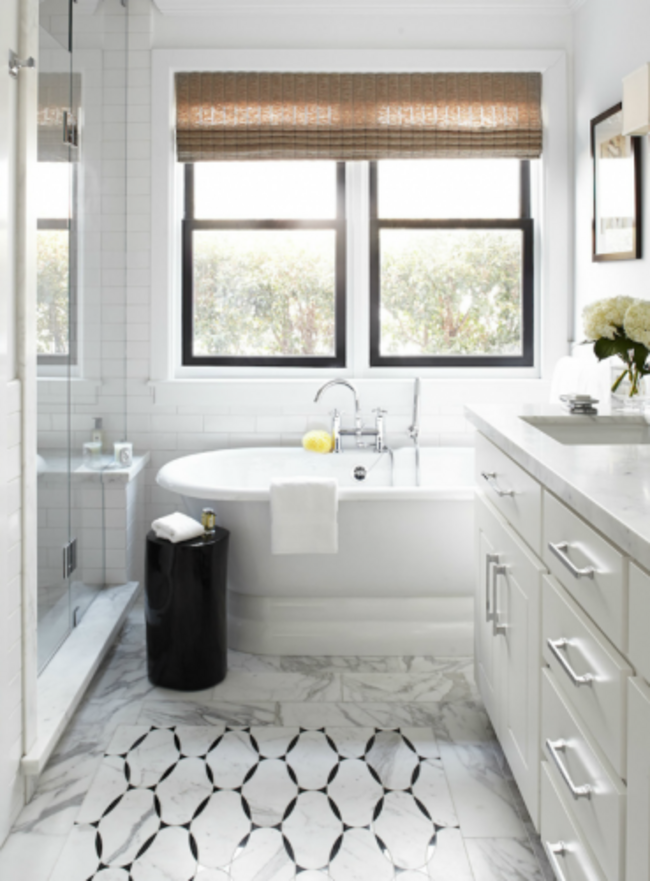 However, here’s another tip to bring glamour into a fairly minimalist space. In the bathroom that leads from the wardrobe, plain white subway-style tiles have been used on the walls, but the same simple cabinets and a free-standing bath give a ‘finished’ hotel-style feel to the room: