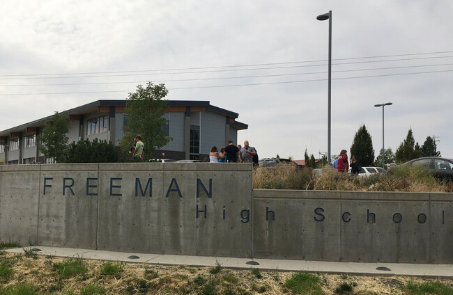 People gather outside of Freeman High School after reports of a shooting KHQ via AP