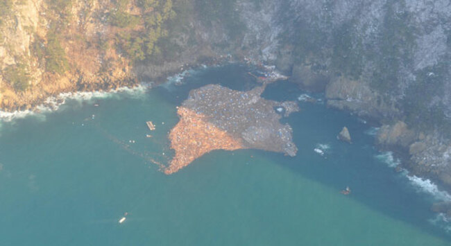 Debris accumulated near the coast of Yamada, Japan following the tsunami. The debris has dispersed since this image was taken (Credit: US Navy Pacific fleet).