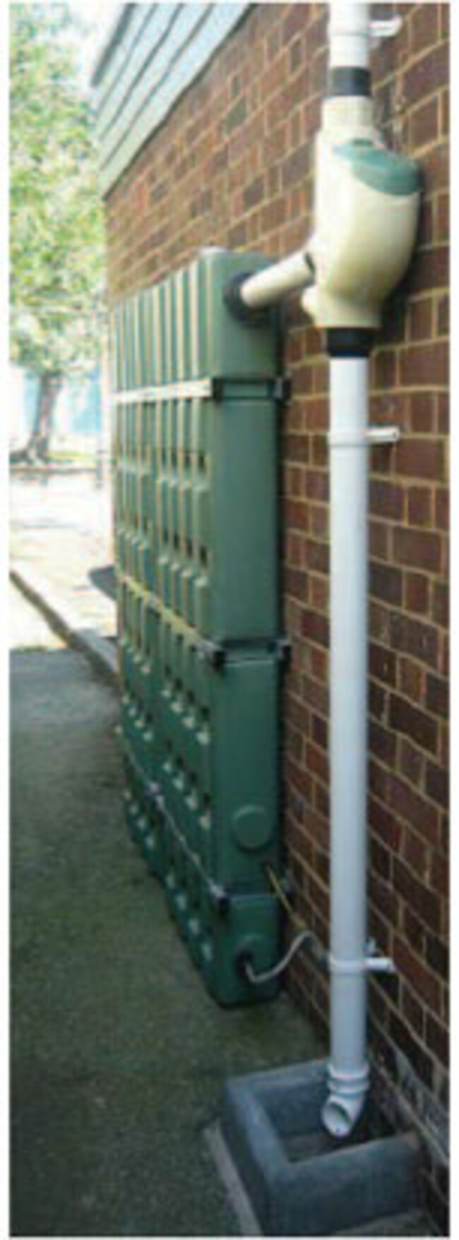 When a service demands rainwater a pump is automatically activated by a pressure switch to draw water from the tank. The flow rate is sufficient to refill a modern toilet cistern in less than a minute and other pump models are available for heavier duty requirements. In the event that demand exceeds the availability of rainwater, a mains water valve is automatically opened to partly refill the tank.