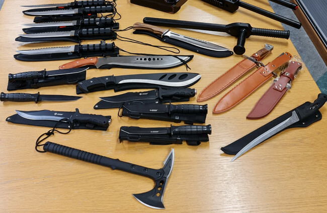 The weapons included knives, a tomahawk style hatchet, pepper spray and a baton.