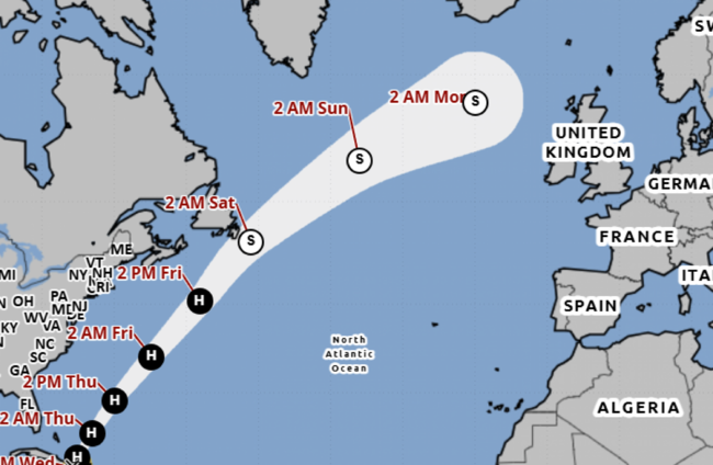 A map from the National Oceanic and Atmospheric Administration predicting the path of the hurricane shows that it may come quite close to Ireland.