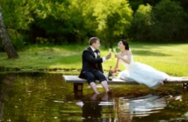 A typical Irish wedding scene... Bride and groom drinking champagne by the lake via Shutterstock