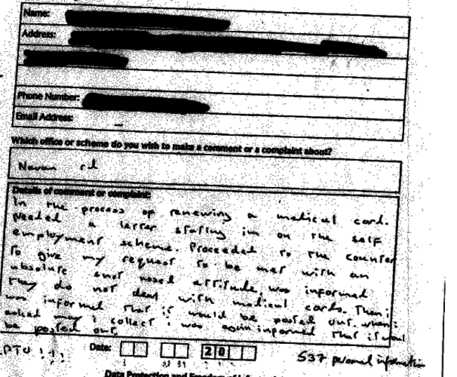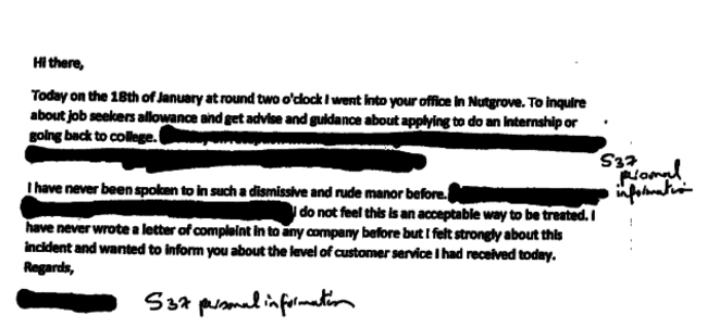 The explanation started with “When I got down to my local office I was met by…”, but a substantial section of the complaint was redacted, including all of the specific details of this person’s interaction with staff.