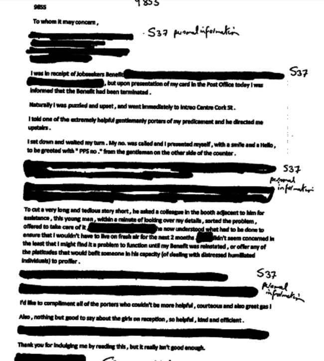 “While at the counter I noticed and read the code of conduct, which I assume applies to both employees and the public alike, and I feel that the Intreo officer’s behaviour was unnecessarily hostile after a certain point in our conversation,” the complainant stated further down in the letter.