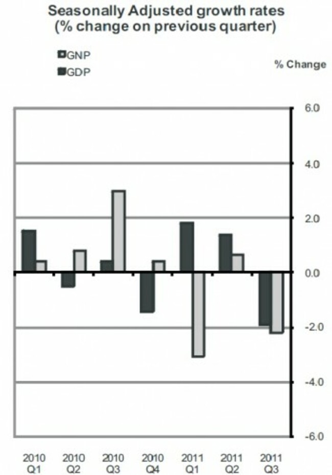 To recap, the Irish economy is still officially the worst-performing one of all the 27 EU states. Our Gross Domestic Product (GDP) fell by 1.9 per cent in the months from July to September this year. Gross National Product (GNP), a more accurate barometer of economic performance, fell by 2.2 per cent in that time. This contraction in the economy is the worst since early 2009 and reverses the growth trend of Q1 and Q2 of this year.