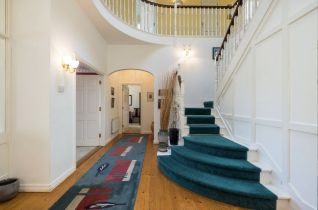 When you enter the home, you are greeted by a sweeping staircase framed by warm natural timber flooring and decorative wall panelling.
